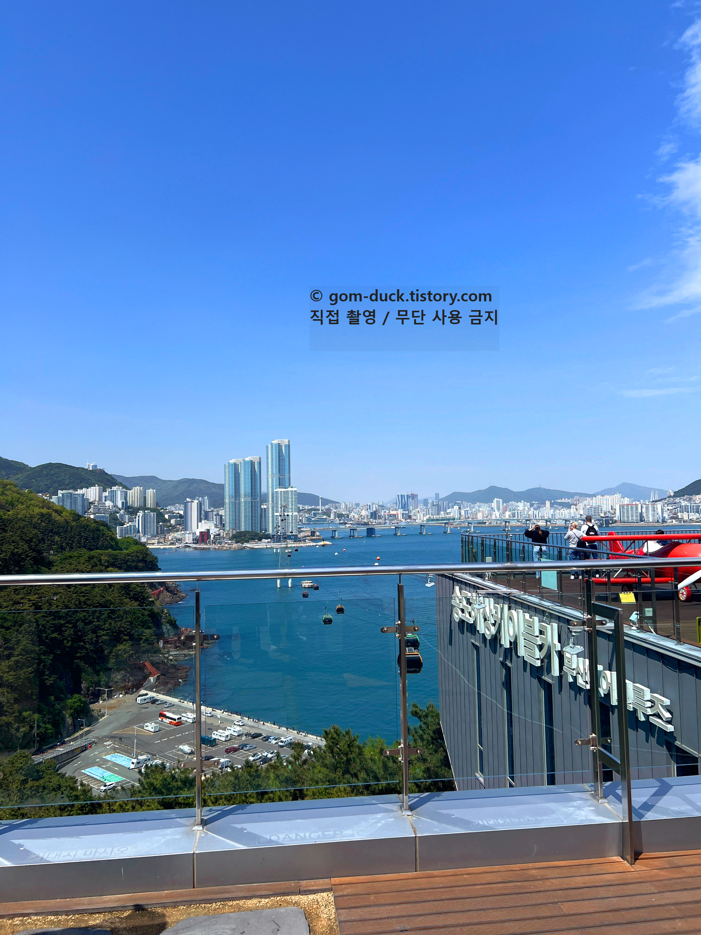 유리창 너머로 펼쳐지는 풍경은 정말 압도적입니다. 한쪽으로는 부산의 대표 항만 도시 풍경이 펼쳐지고, 다른 쪽으로는 푸르른 바다 위를 가르는 케이블카가 줄지어 지나가며 마치 하늘을 나는 듯한 체험을 선사합니다. 특히 도시와 바다, 산과 다리까지 한 프레임에 담기는 풍경은 국내에서도 보기 드문 구성으로, 해운대나 광안리에서도 경험하기 힘든 독특한 조합입니다.